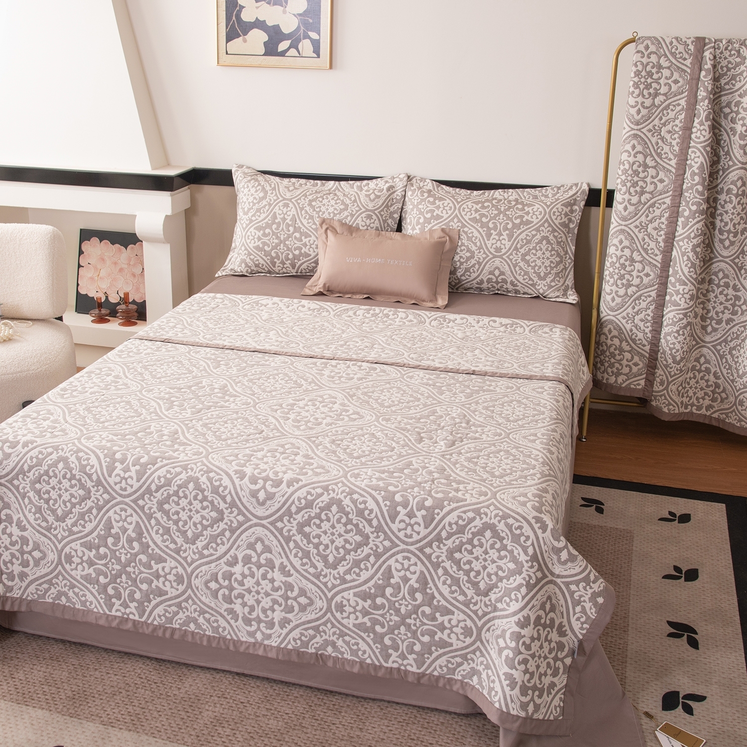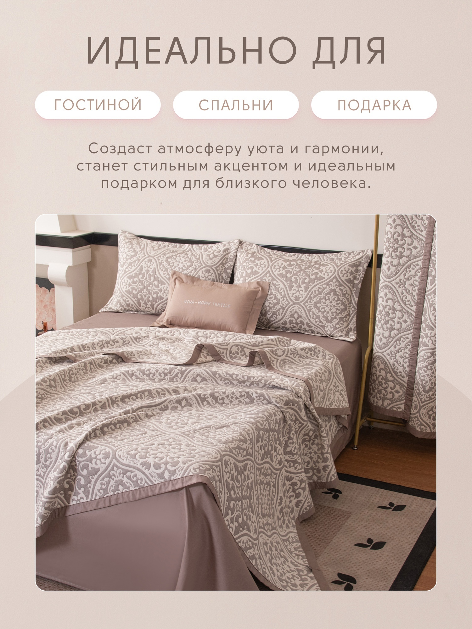 Покрывала двухсторонние Aurora Veil - коллекция, в которой продумана каждая деталь. Мягкое двустороннее покрывало с изысканным дизайном создаёт гармоничный, законченный образ спальни и наполняет пространство атмосферой лёгкости и уюта. Покрывало выполнено из жаккардового муслина с декоративной простёжкой, формирующей утончённый рельефный узор. Ткань отличается мягкостью, лёгким благородным блеском и изысканной текстурой. Завершает композицию широкий кант, придающий изделию гармоничную завершённость. Реверсивный дизайн покрывала с инверсией оттенков позволяет выбрать настроение пространства: на одной стороне - светлый фон с мягким контрастным рисунком, на другой - более тёмный фон со светлым узором. Игра фактур и тонов делает покрывало выразительным акцентом в интерьере и позволяет легко менять облик спальни.
