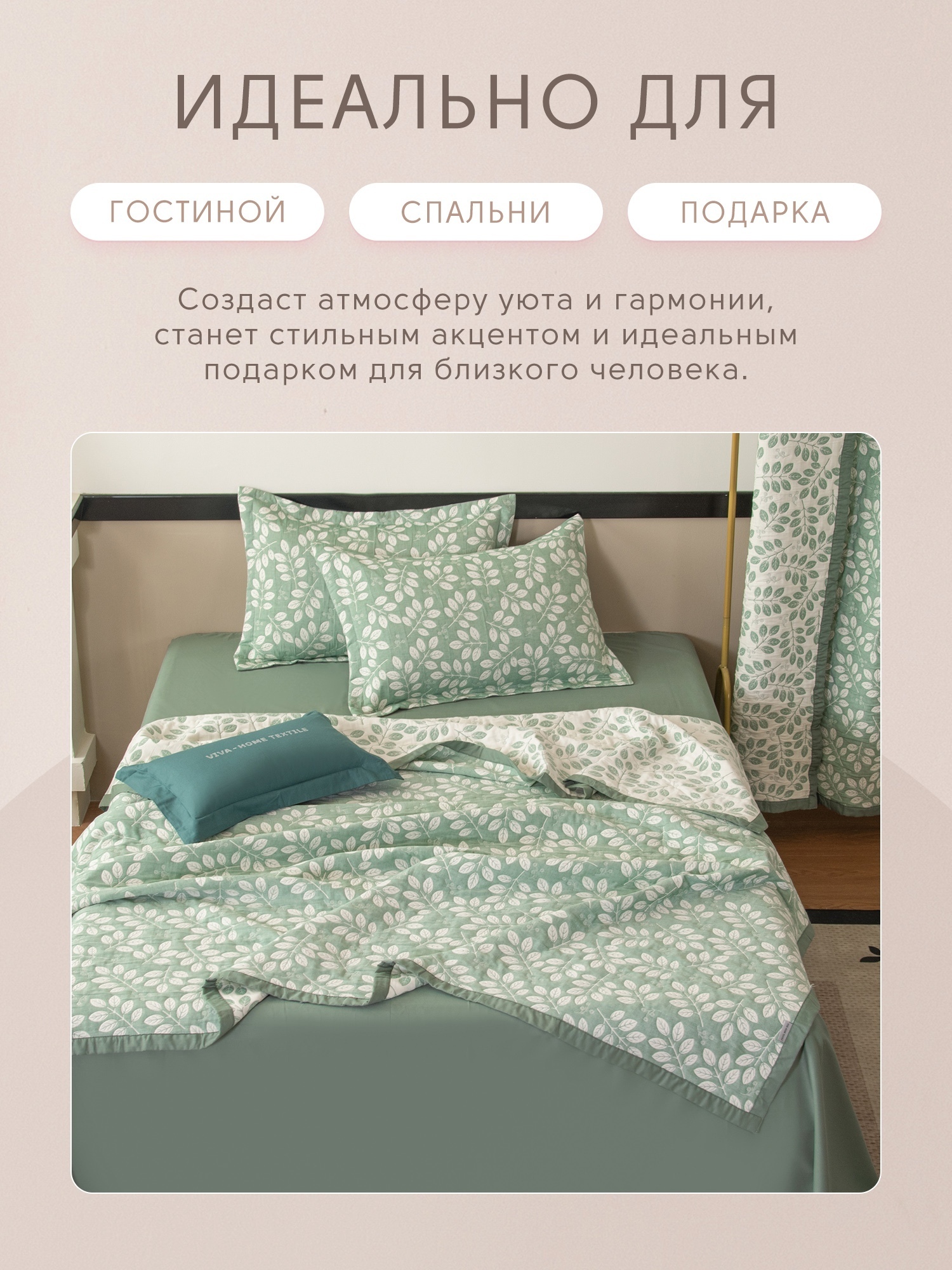 Покрывала двухсторонние Aurora Veil - коллекция, в которой продумана каждая деталь. Мягкое двустороннее покрывало с изысканным дизайном создаёт гармоничный, законченный образ спальни и наполняет пространство атмосферой лёгкости и уюта. Покрывало выполнено из жаккардового муслина с декоративной простёжкой, формирующей утончённый рельефный узор. Ткань отличается мягкостью, лёгким благородным блеском и изысканной текстурой. Завершает композицию широкий кант, придающий изделию гармоничную завершённость. Реверсивный дизайн покрывала с инверсией оттенков позволяет выбрать настроение пространства: на одной стороне - светлый фон с мягким контрастным рисунком, на другой - более тёмный фон со светлым узором. Игра фактур и тонов делает покрывало выразительным акцентом в интерьере и позволяет легко менять облик спальни.