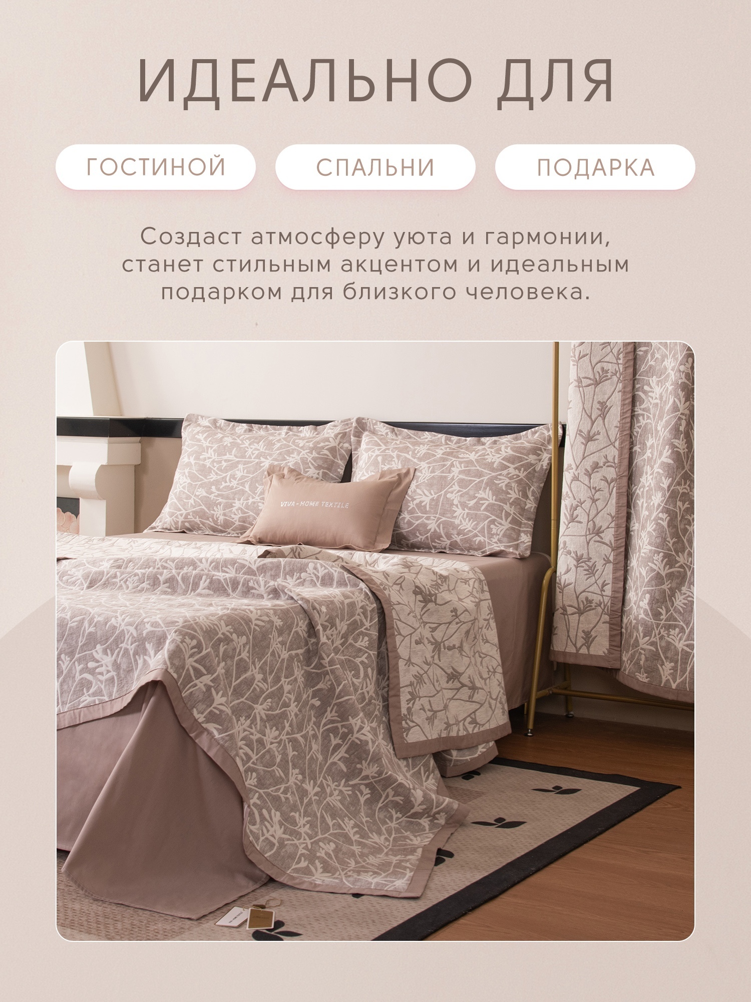 Покрывала двухсторонние Aurora Veil - коллекция, в которой продумана каждая деталь. Мягкое двустороннее покрывало с изысканным дизайном создаёт гармоничный, законченный образ спальни и наполняет пространство атмосферой лёгкости и уюта. Покрывало выполнено из жаккардового муслина с декоративной простёжкой, формирующей утончённый рельефный узор. Ткань отличается мягкостью, лёгким благородным блеском и изысканной текстурой. Завершает композицию широкий кант, придающий изделию гармоничную завершённость. Реверсивный дизайн покрывала с инверсией оттенков позволяет выбрать настроение пространства: на одной стороне - светлый фон с мягким контрастным рисунком, на другой - более тёмный фон со светлым узором. Игра фактур и тонов делает покрывало выразительным акцентом в интерьере и позволяет легко менять облик спальни.