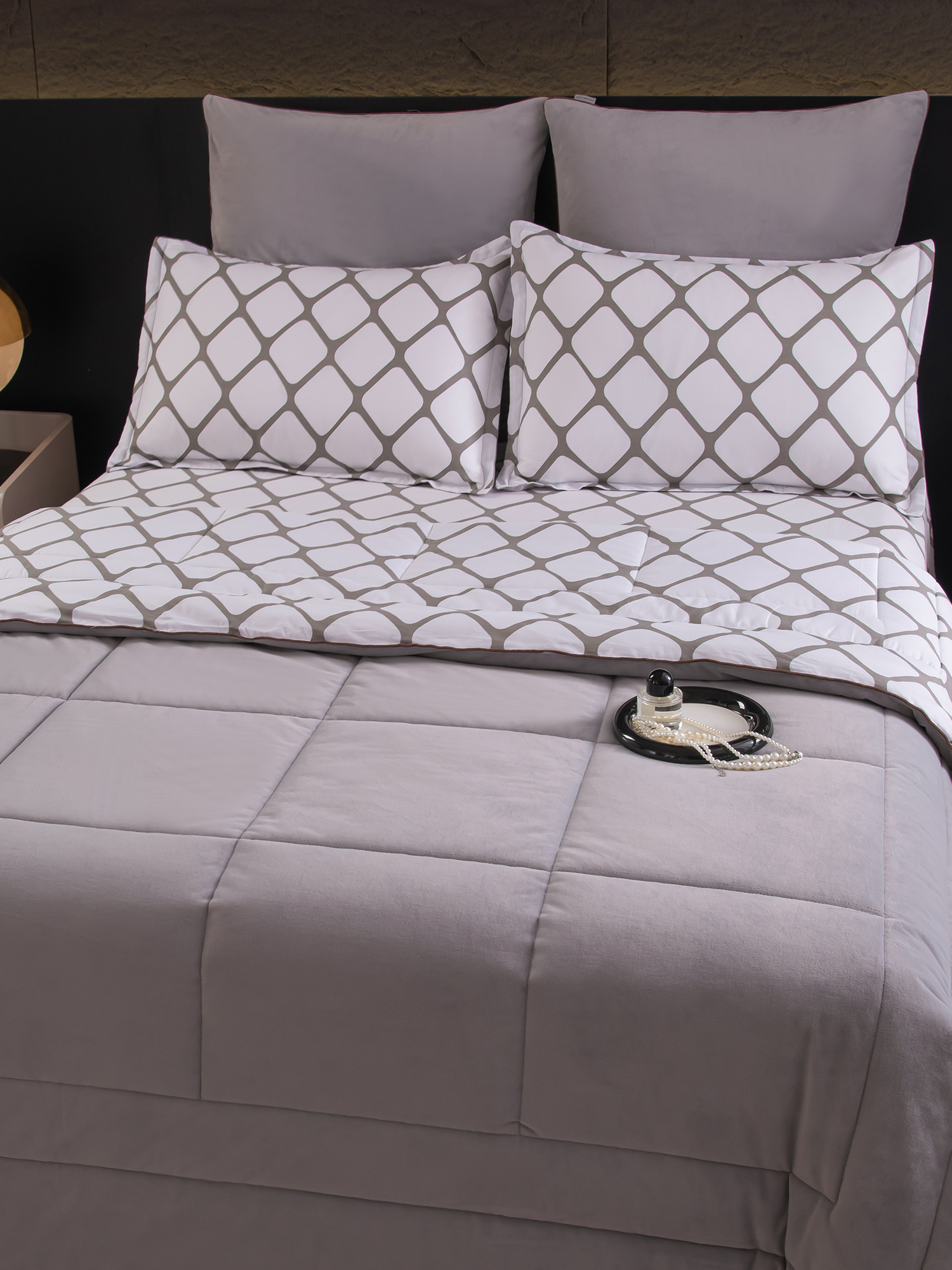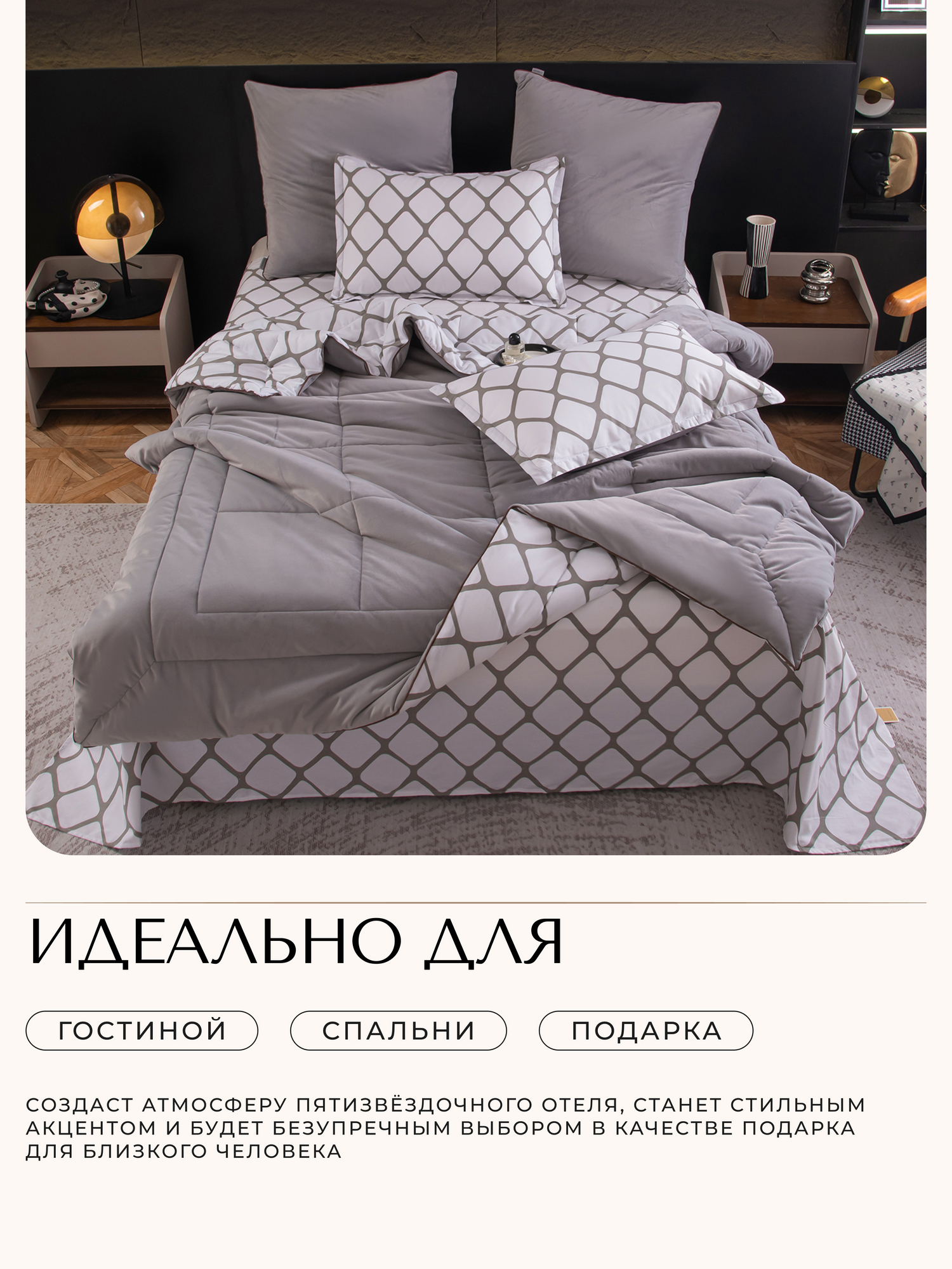Одеяло выполнено с изысканной геометрической стёжкой и оформлено бархатным кантом. Верхняя сторона: мягкий велюр, придающий комплекту благородный вид и особую уютность, нижняя сторона: сатин из 100% хлопка, обеспечивающий естественную воздухопроницаемость и комфорт во время сна. Наполнитель: современное 100% эковолокно микрогель, лёгкое, гипоаллергенное и сохраняющее форму даже после многократных стирок. Зимой под таким одеялом тепло и уютно, а летом благодаря отличной циркуляции воздуха не будет жарко.