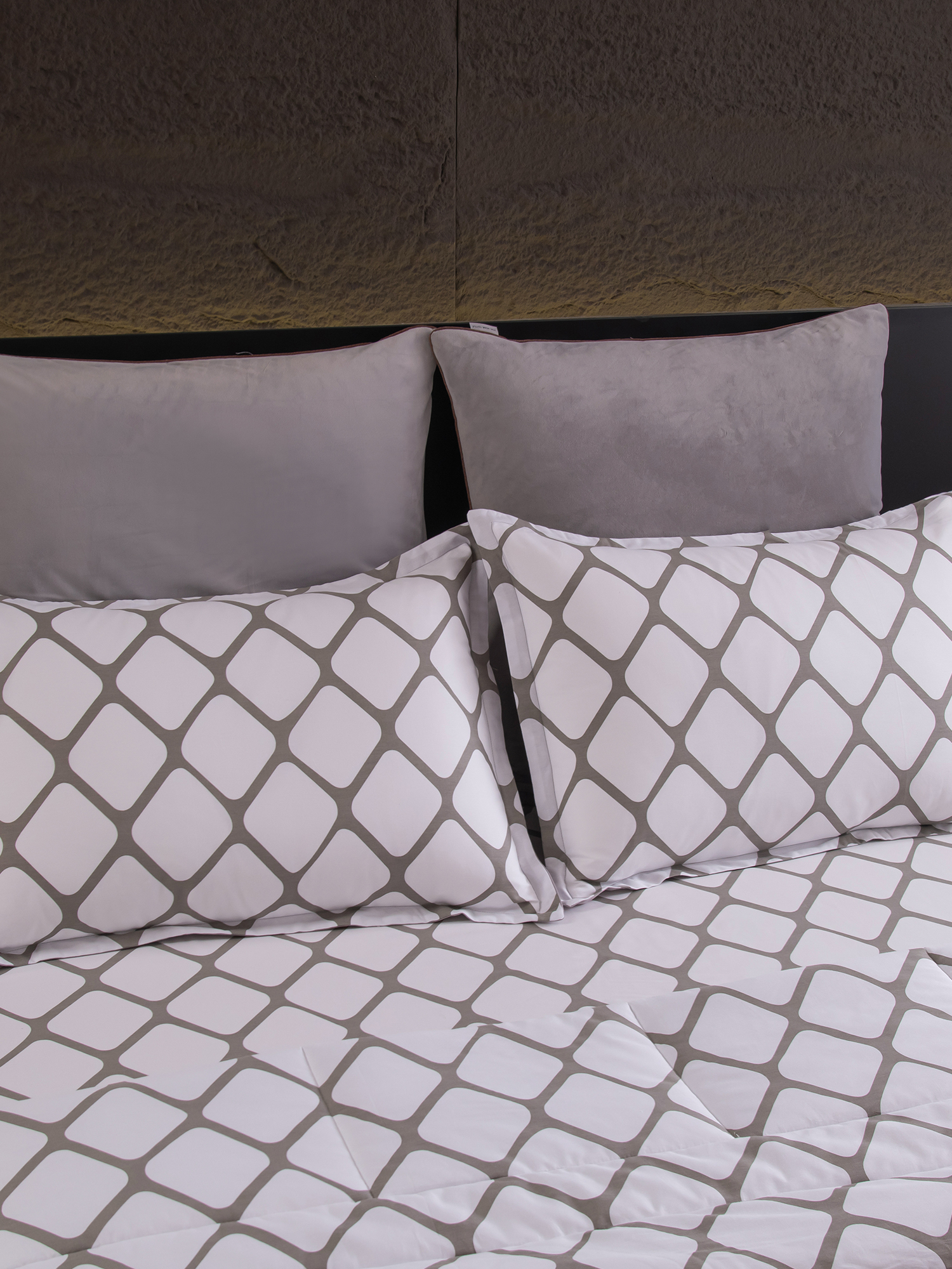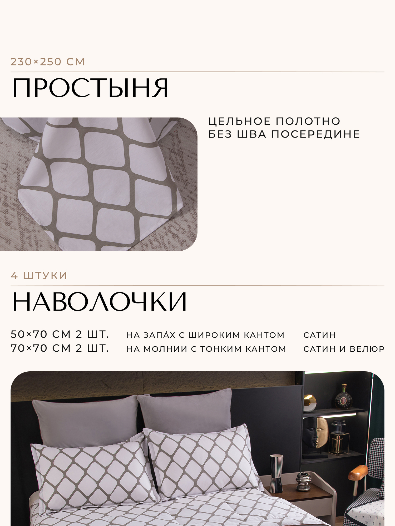 В комплект входят четыре наволочки: 50x70 см (2 шт) с запАхом (кармашком) выполнены из сатина 100% хлопка, с ушками и широким кантом по периметру; 70x70 см (2 шт) на молнии - верх из мягкого велюра, низ из сатина 100% хлопка, оформлены бархатным кантом.