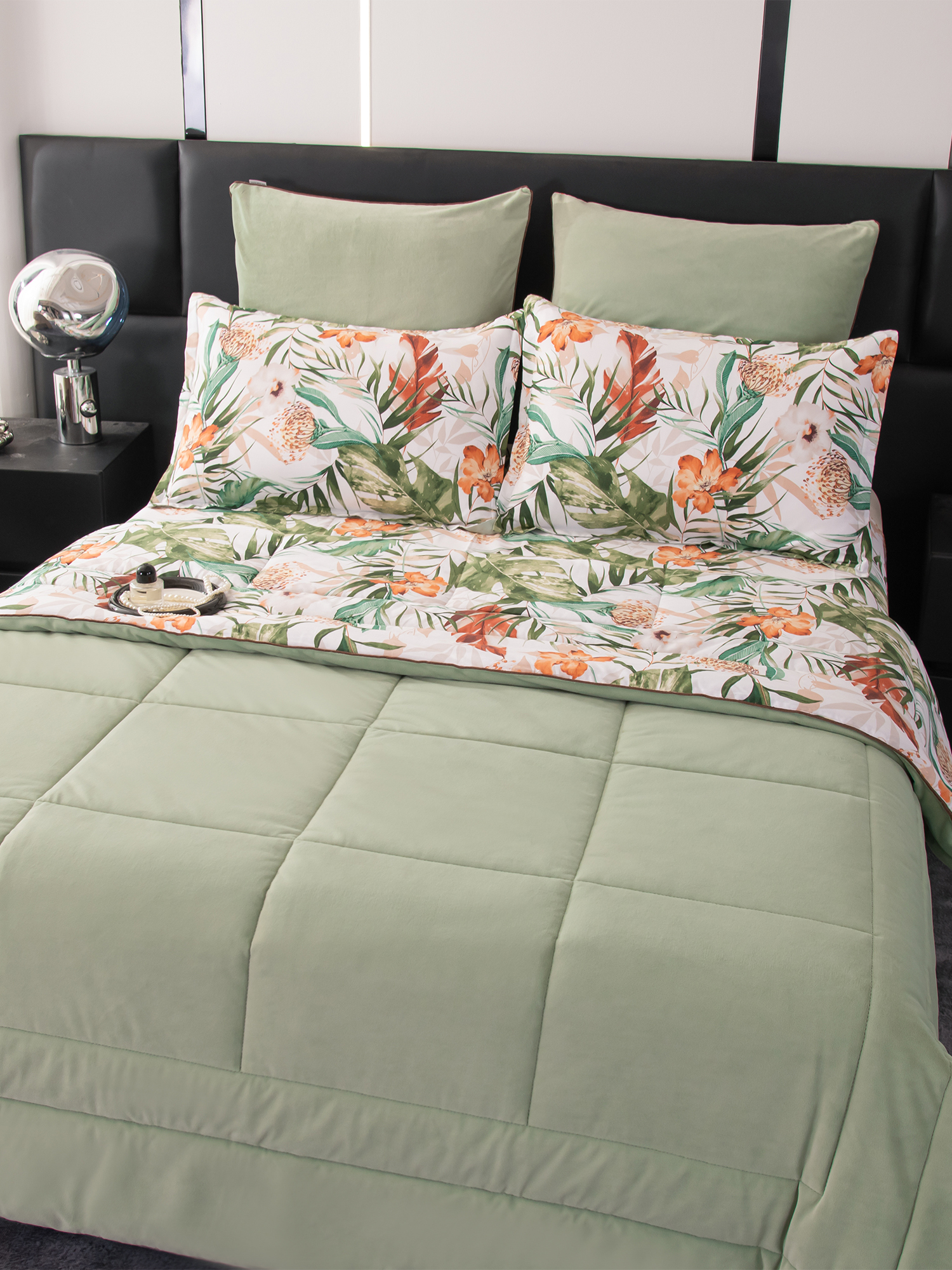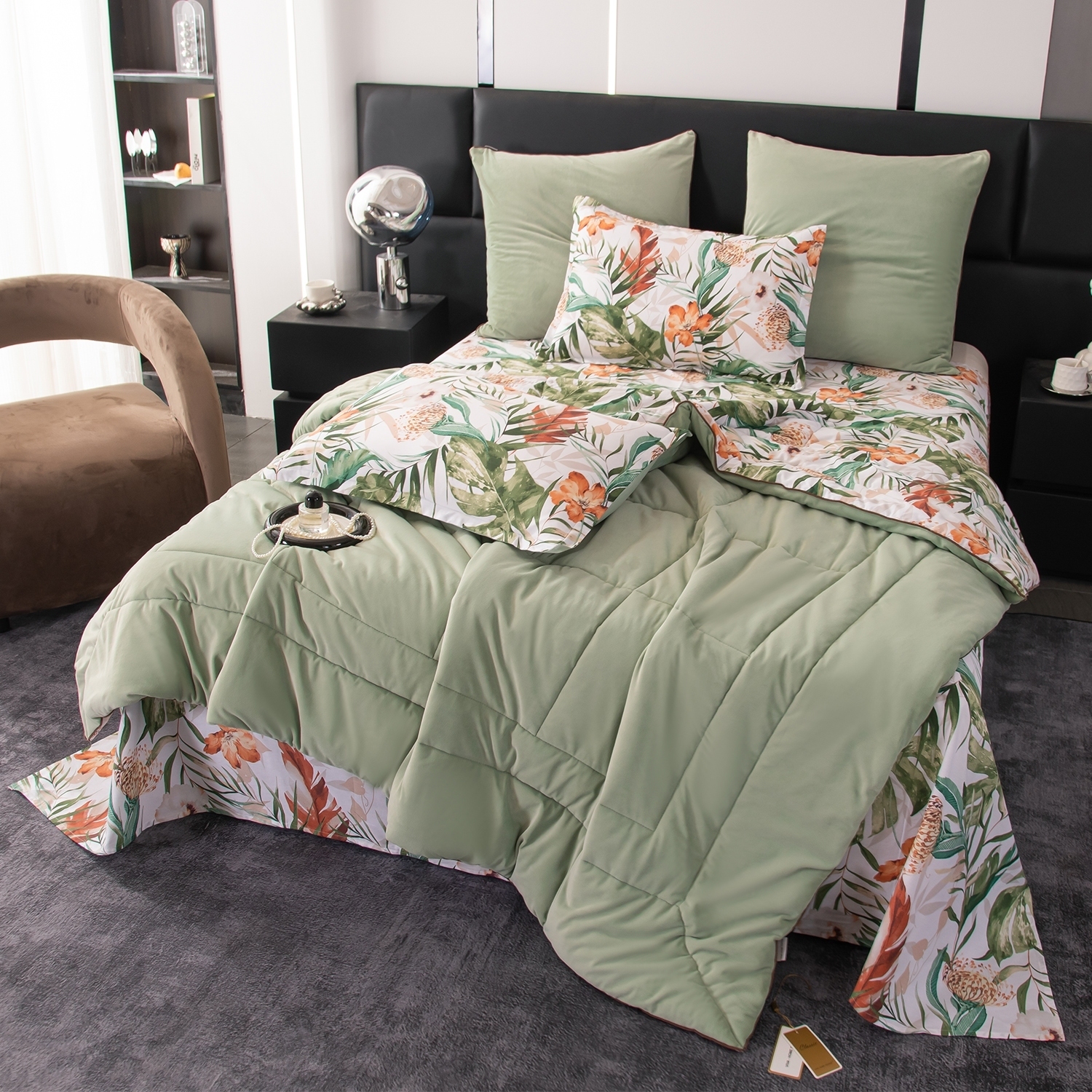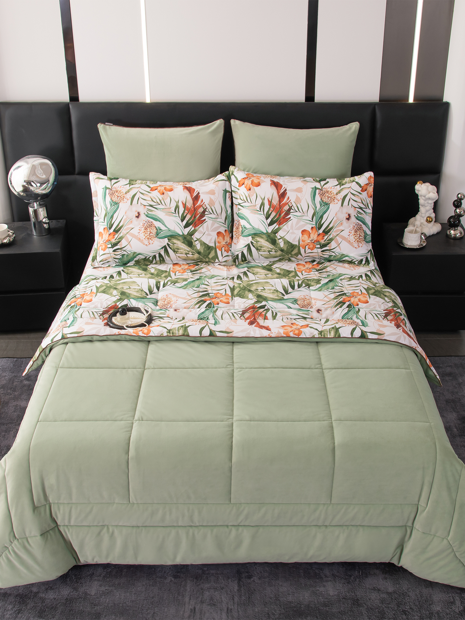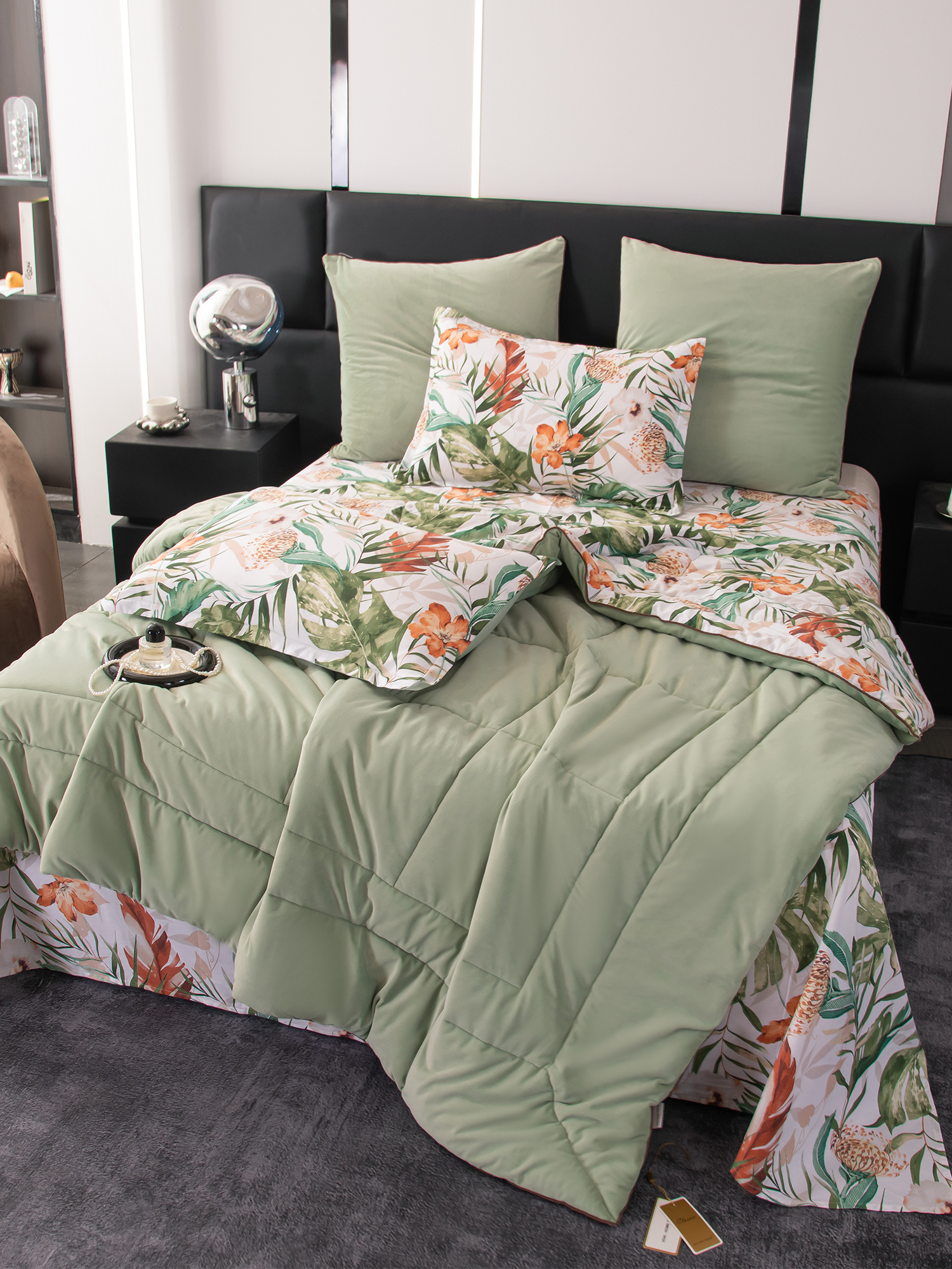 Ткань компаньон: Одеяло и наволочки 70x70 с разных сторон разной расцветки и ткани; наволочки 50x70 с разных сторон разной расцветки (принт/однотонный); простыня такого же цвета, как низ одеяла.