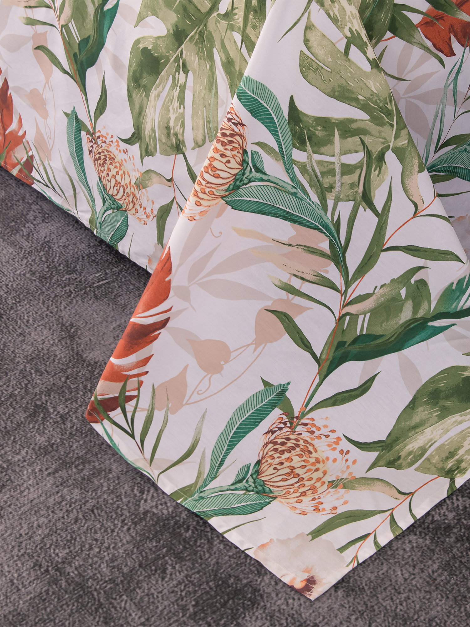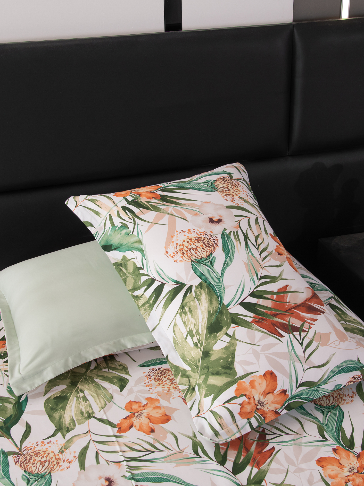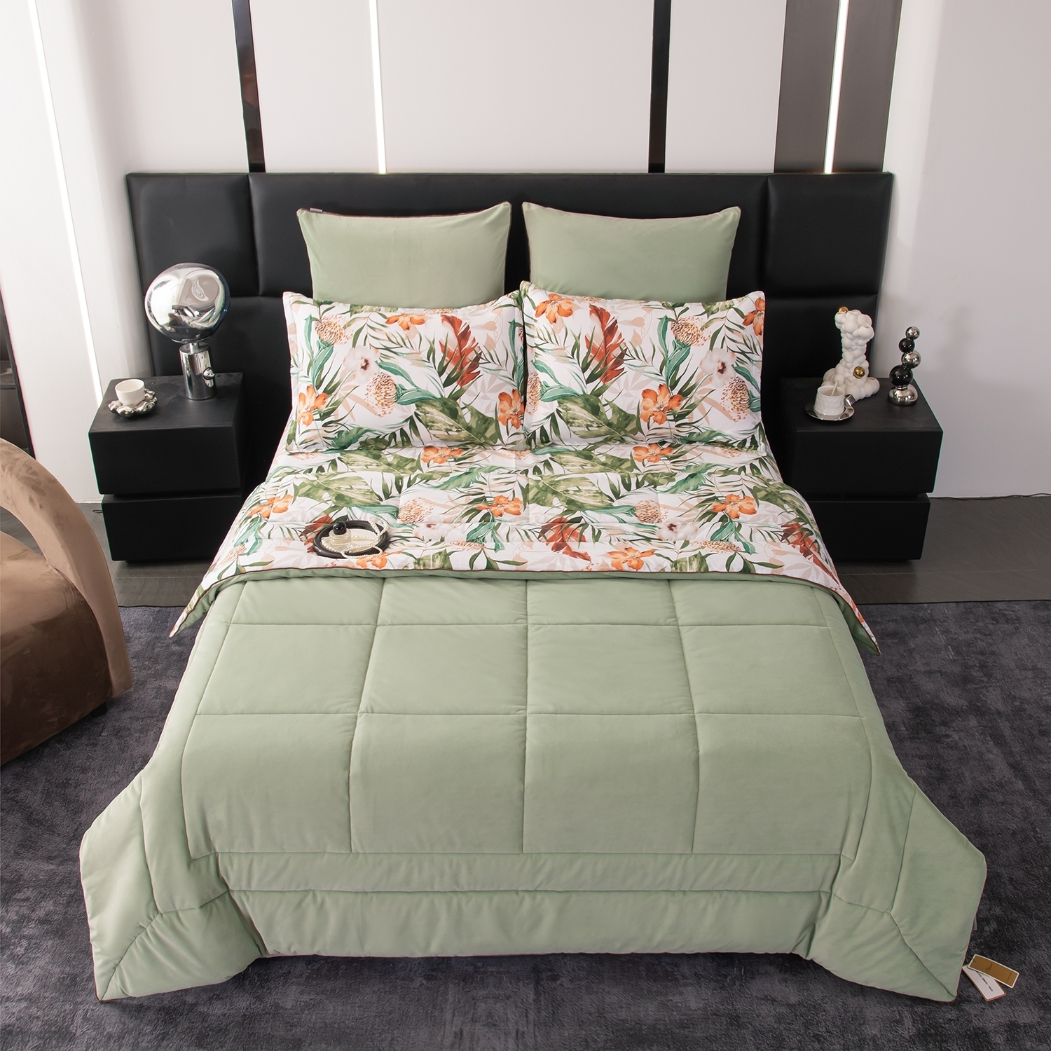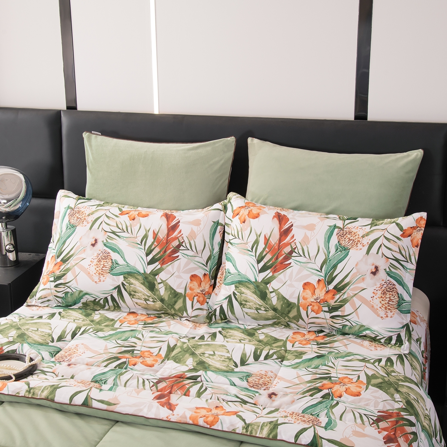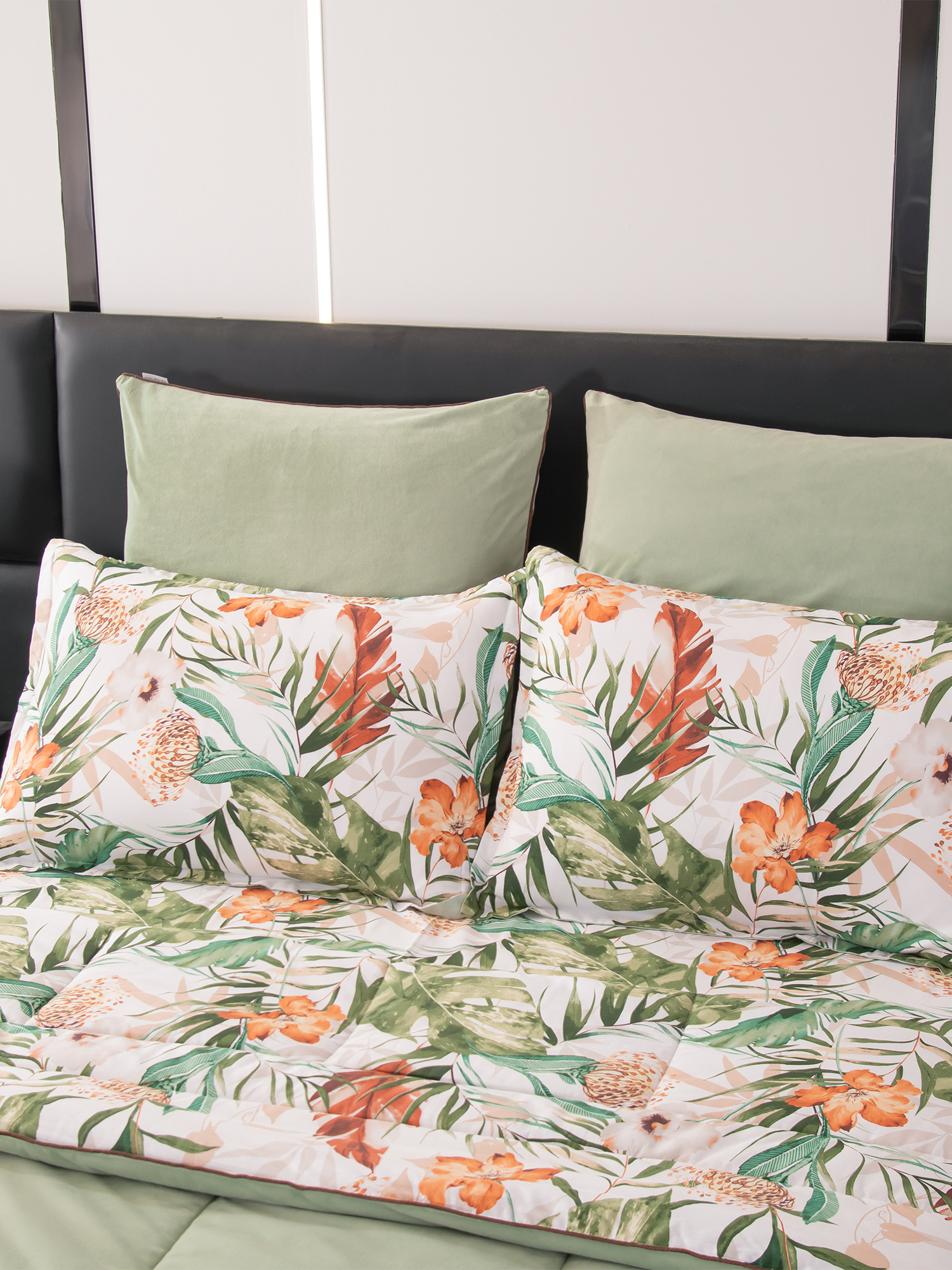 Ткань компаньон: Одеяло и наволочки 70x70 с разных сторон разной расцветки и ткани; наволочки 50x70 с разных сторон разной расцветки (принт/однотонный); простыня такого же цвета, как низ одеяла.
