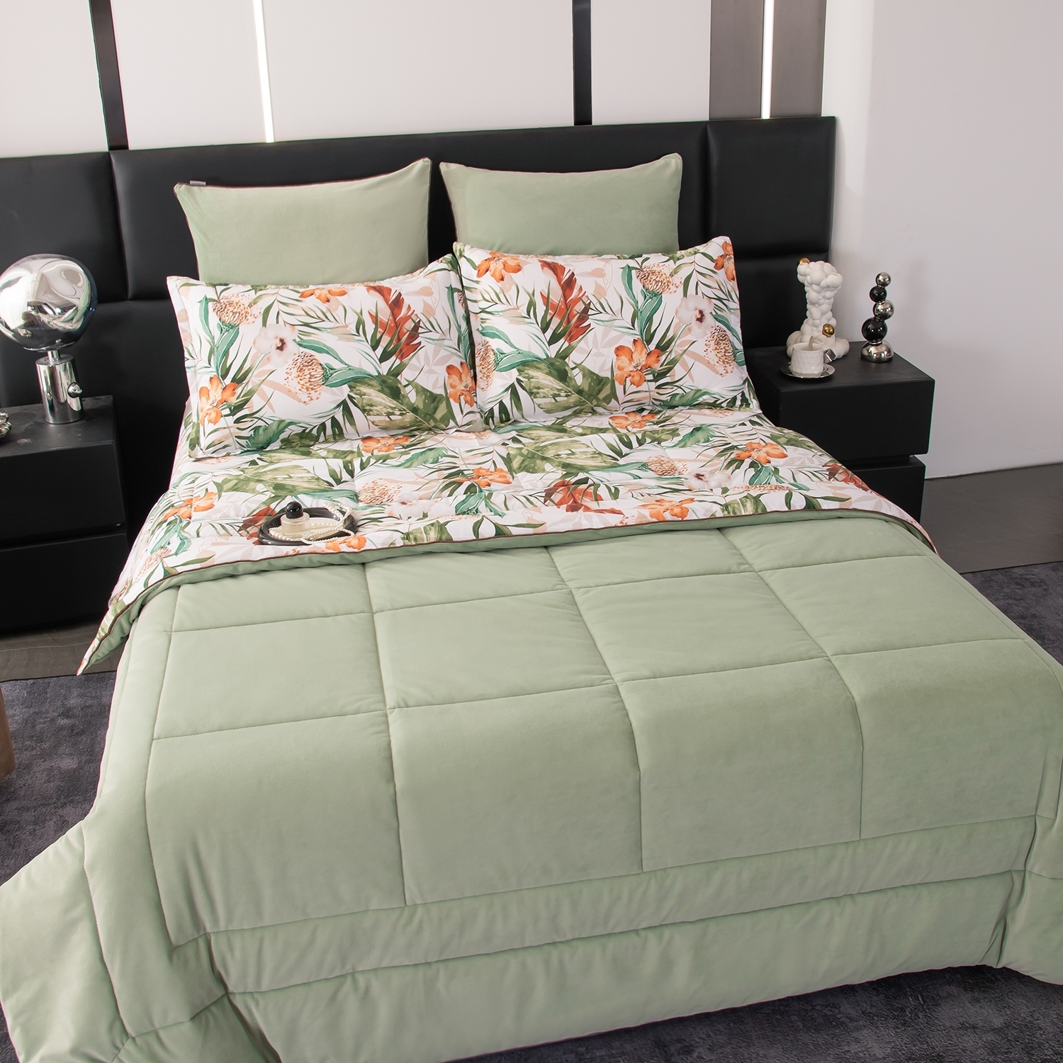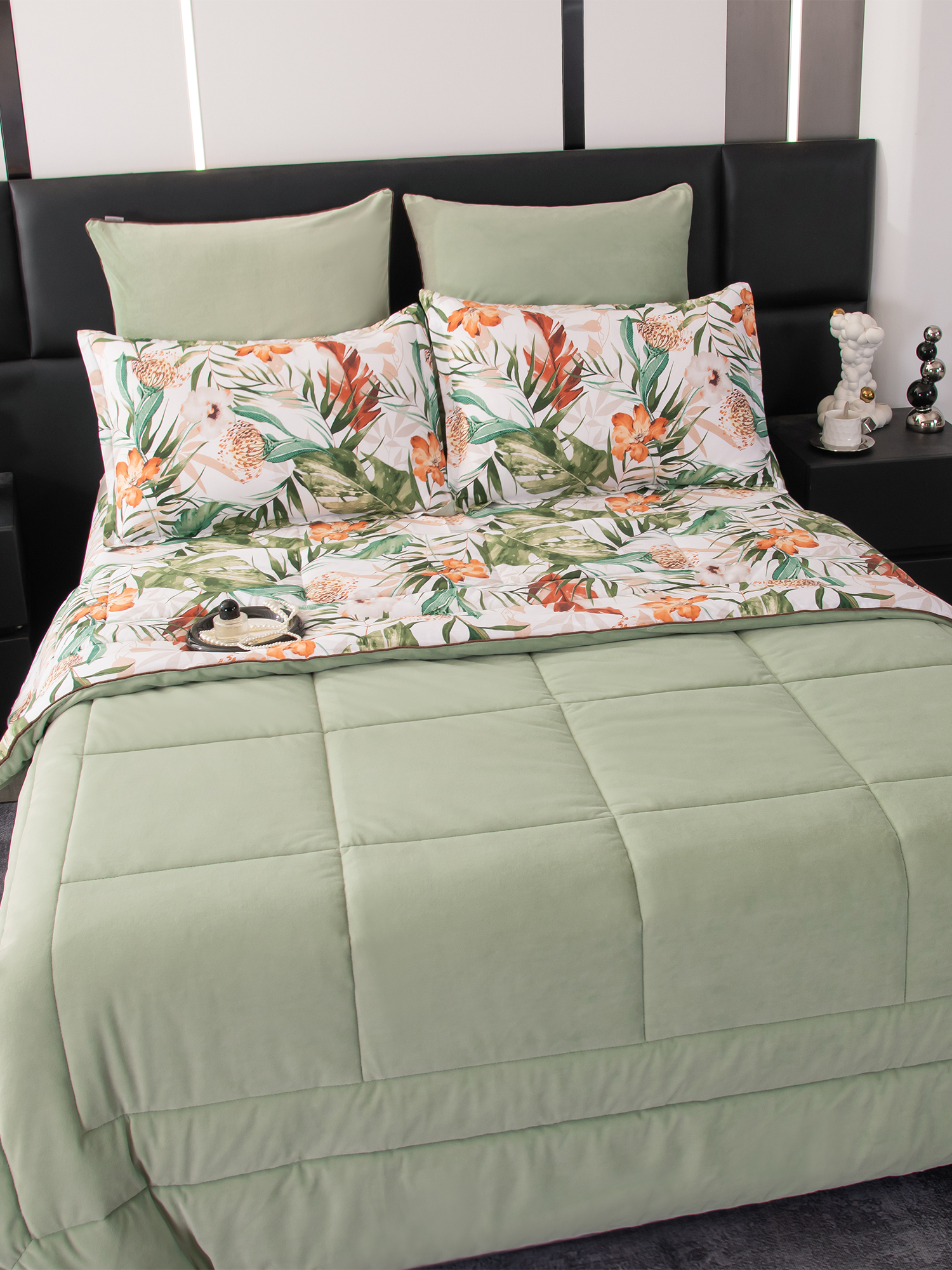 Комплект постельного белья Сатин Velouria Luxe с Одеялом - это сочетание изысканного дизайна, премиальных материалов и максимального комфорта. Вам больше не придётся тратить время на заправку одеяла в пододеяльник: его заменяет стеганое одеяло-покрывало, которое сразу идёт в комплекте и полностью соответствует дизайну белья. Данный комплект - это готовое решение для спальни, в котором красота, комфорт и практичность гармонично объединены. Одеяло выполнено с изысканной геометрической стёжкой и оформлено бархатным кантом. Верхняя сторона: мягкий велюр, придающий комплекту благородный вид и особую уютность, нижняя сторона: сатин из 100% хлопка, обеспечивающий естественную воздухопроницаемость и комфорт во время сна.