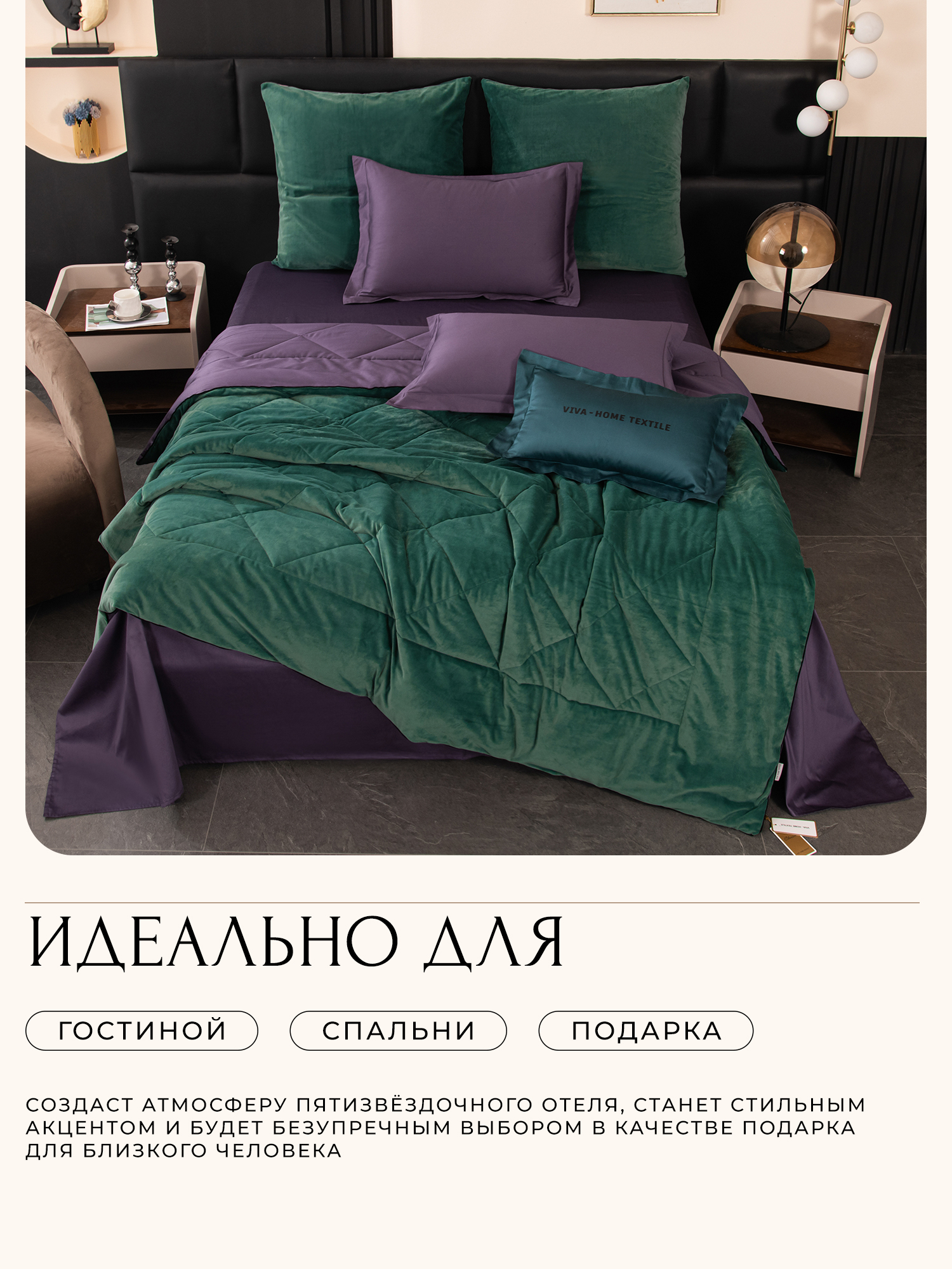 Одеяло выполнено с изысканной геометрической стёжкой и оформлено бархатным кантом. Верхняя сторона - мягкий велюр, придающий комплекту благородный внешний вид и особую уютность. Нижняя сторона - гладкий сатин из 100% египетского хлопка, отличающийся особой прочностью, шелковистым блеском и естественной воздухопроницаемостью.