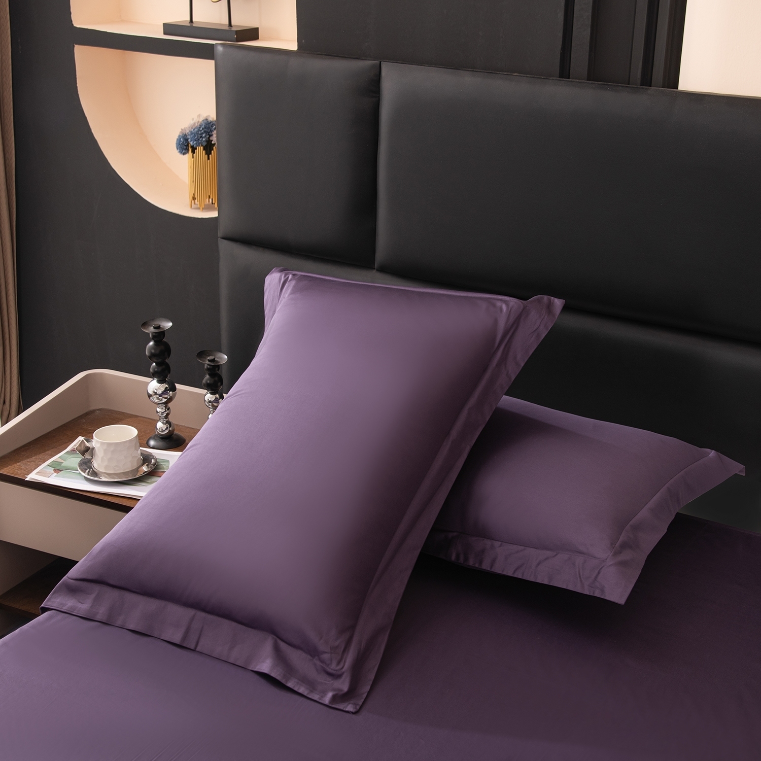 В комплект входят четыре наволочки: 50x70 см (2 шт) с запАхом (кармашком), выполненные из сатина 100% египетского хлопка, с ушками и широким кантом по периметру; 70x70 см (2 шт) на молнии - верх из мягкого велюра, низ из сатина 100% египетского хлопка, оформлены бархатным кантом.