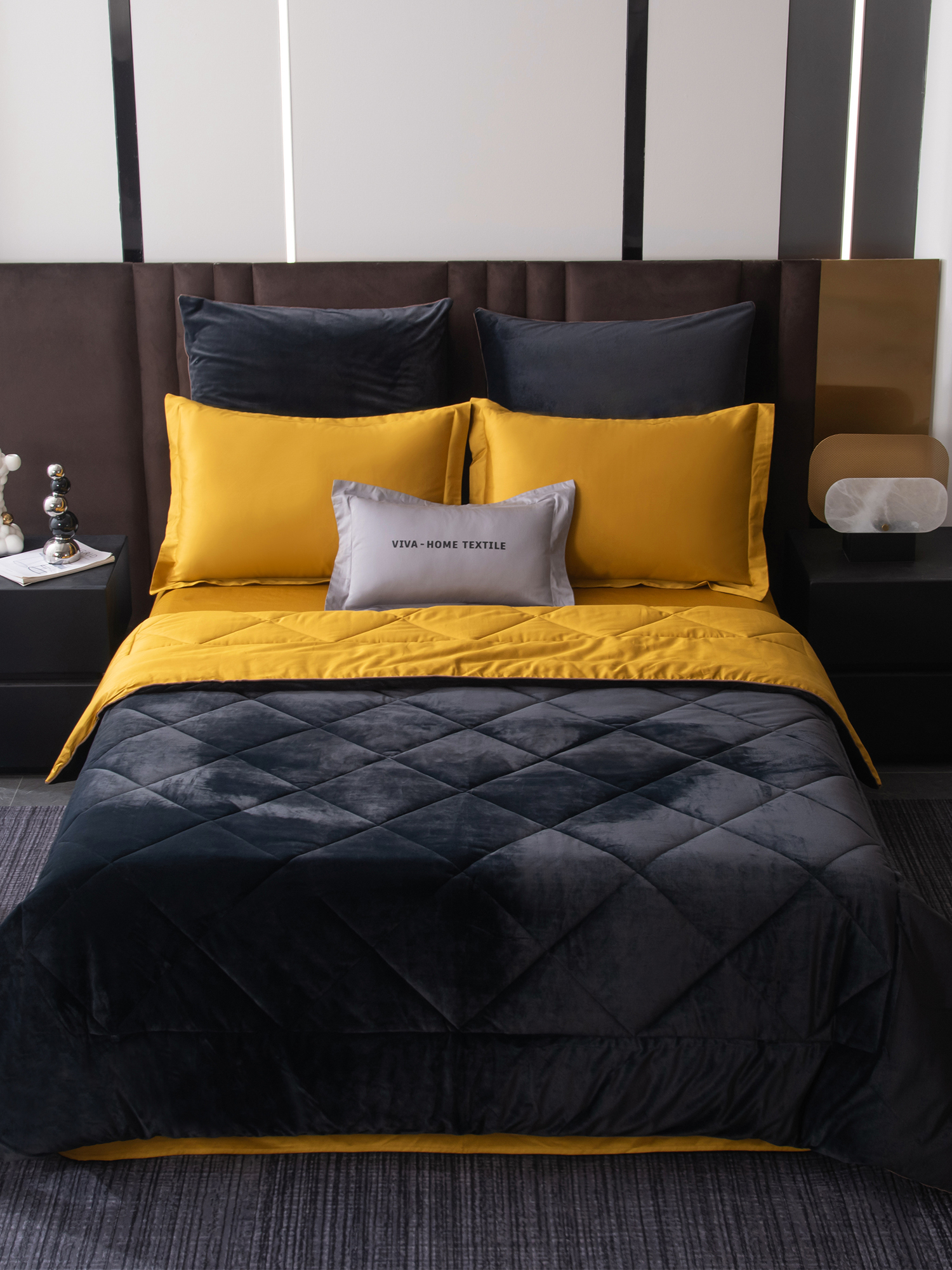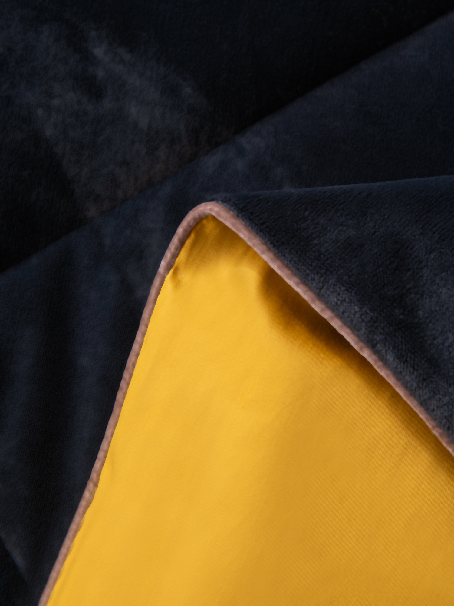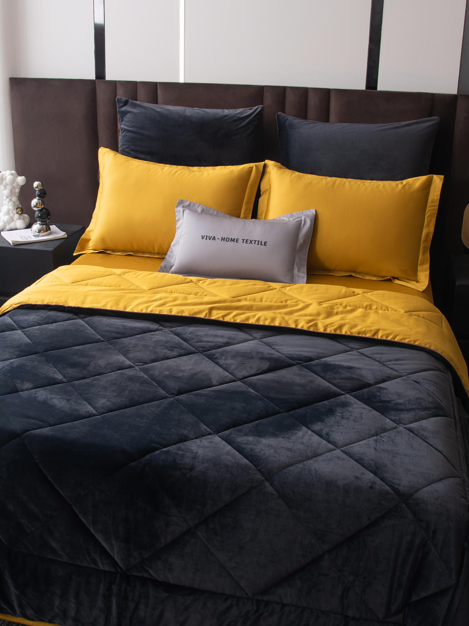 Одеяло выполнено с изысканной геометрической стёжкой и оформлено бархатным кантом. Верхняя сторона - мягкий велюр, придающий комплекту благородный внешний вид и особую уютность. Нижняя сторона - гладкий сатин из 100% египетского хлопка, отличающийся особой прочностью, шелковистым блеском и естественной воздухопроницаемостью.