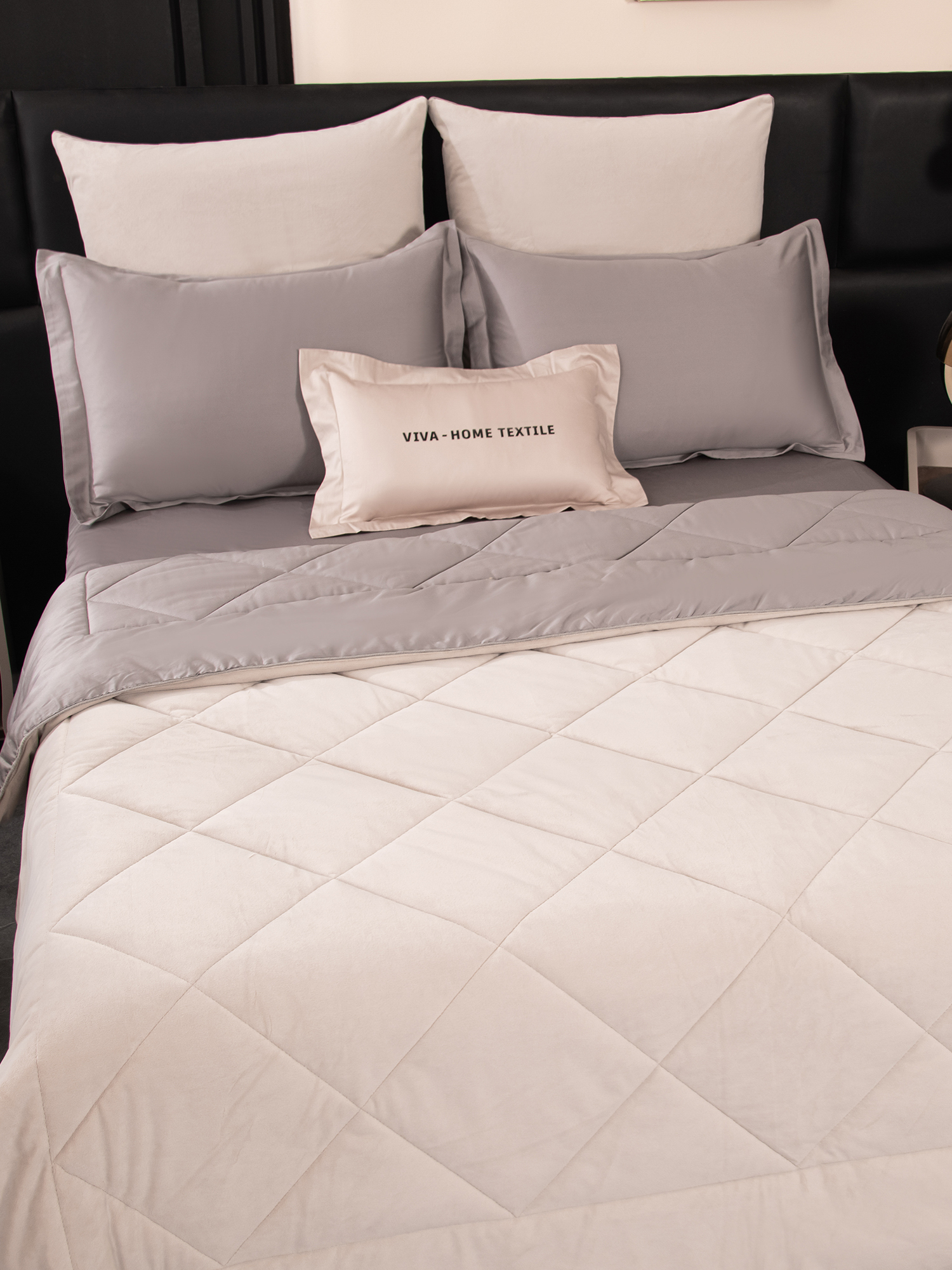 Одеяло выполнено с изысканной геометрической стёжкой и оформлено бархатным кантом. Верхняя сторона - мягкий велюр, придающий комплекту благородный внешний вид и особую уютность. Нижняя сторона - гладкий сатин из 100% египетского хлопка, отличающийся особой прочностью, шелковистым блеском и естественной воздухопроницаемостью. Наполнитель - современное 100% эковолокно микрогель: лёгкий, гипоаллергенный материал, который сохраняет форму даже после многократных стирок. Зимой под таким одеялом тепло и комфортно, а летом - свежо и легко, благодаря отличной циркуляции воздуха.