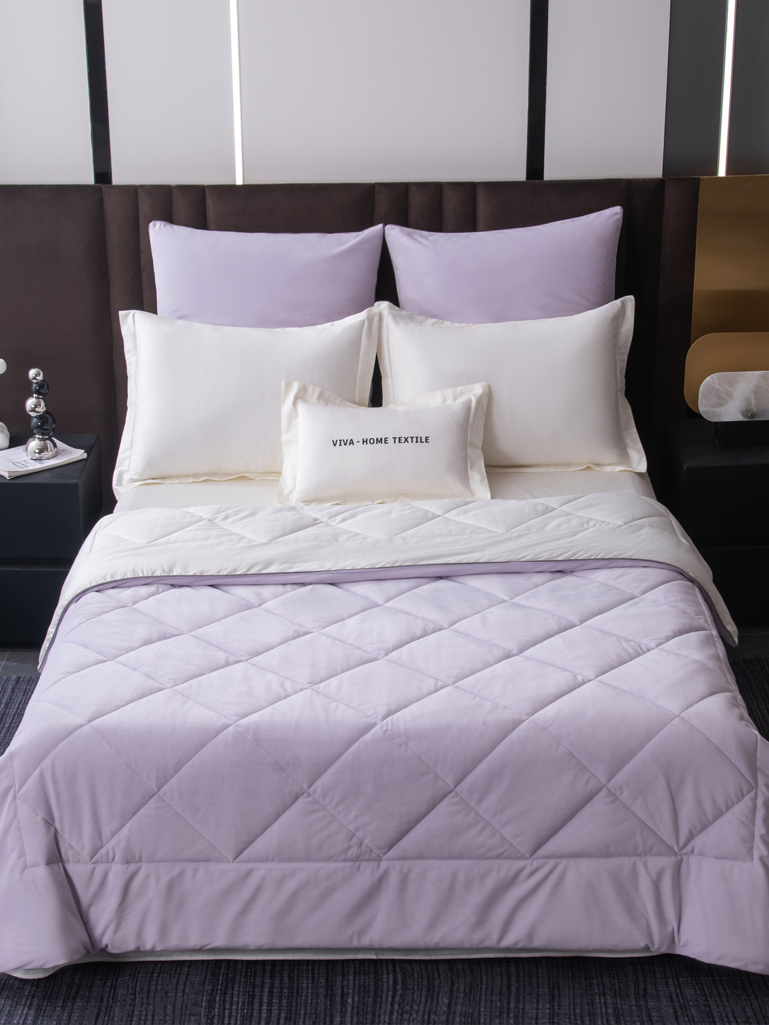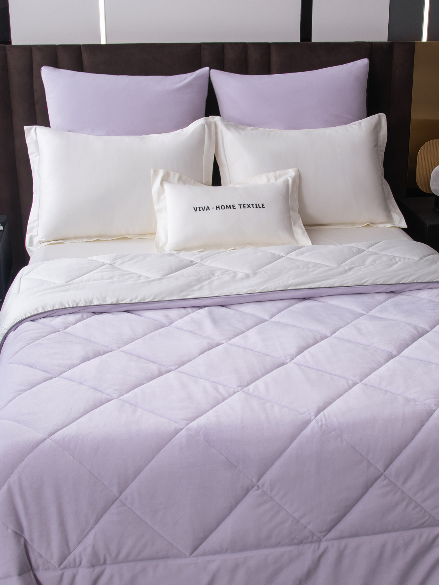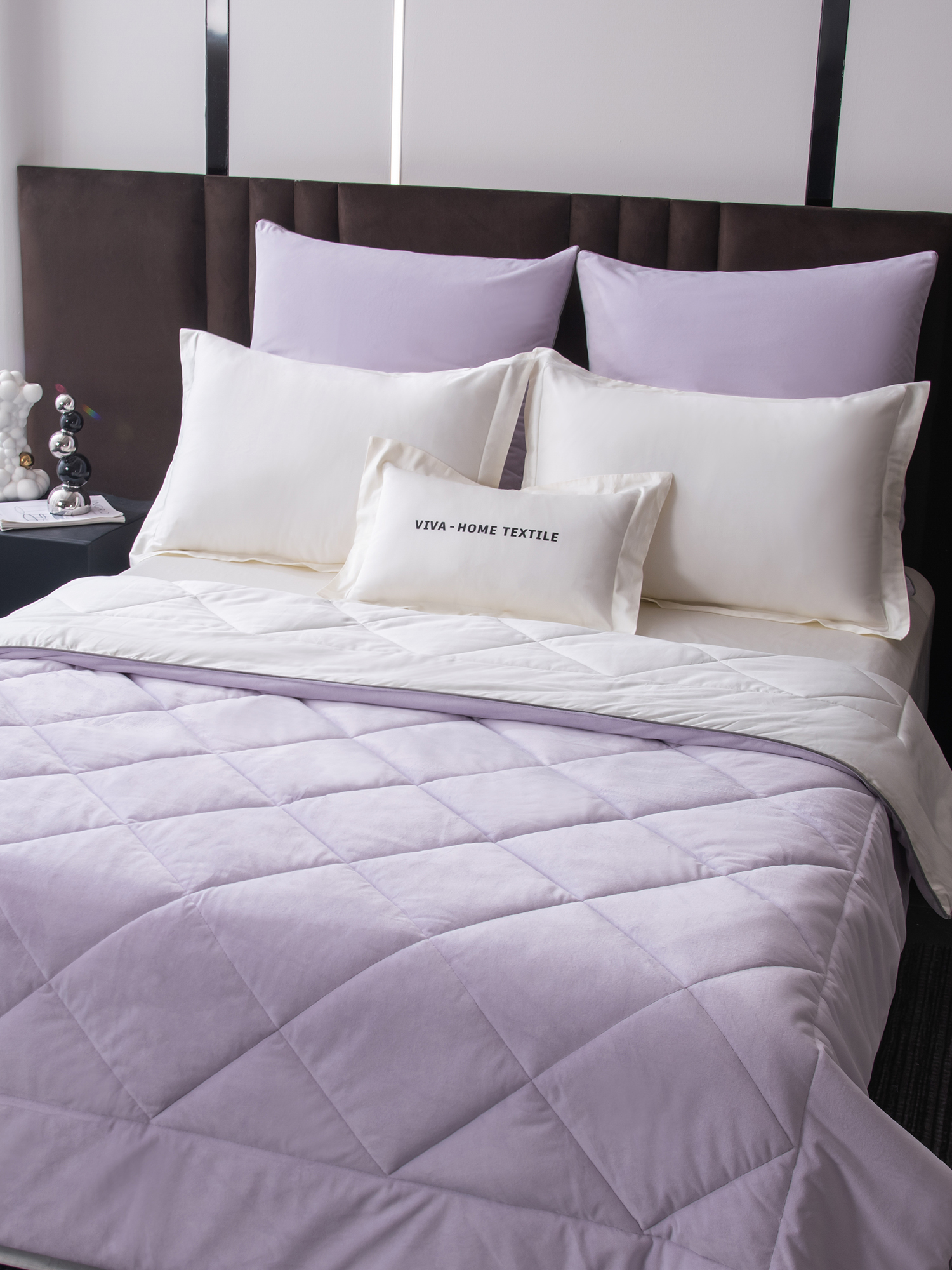 Одеяло выполнено с изысканной геометрической стёжкой и оформлено бархатным кантом. Верхняя сторона - мягкий велюр, придающий комплекту благородный внешний вид и особую уютность. Нижняя сторона - гладкий сатин из 100% египетского хлопка, отличающийся особой прочностью, шелковистым блеском и естественной воздухопроницаемостью.