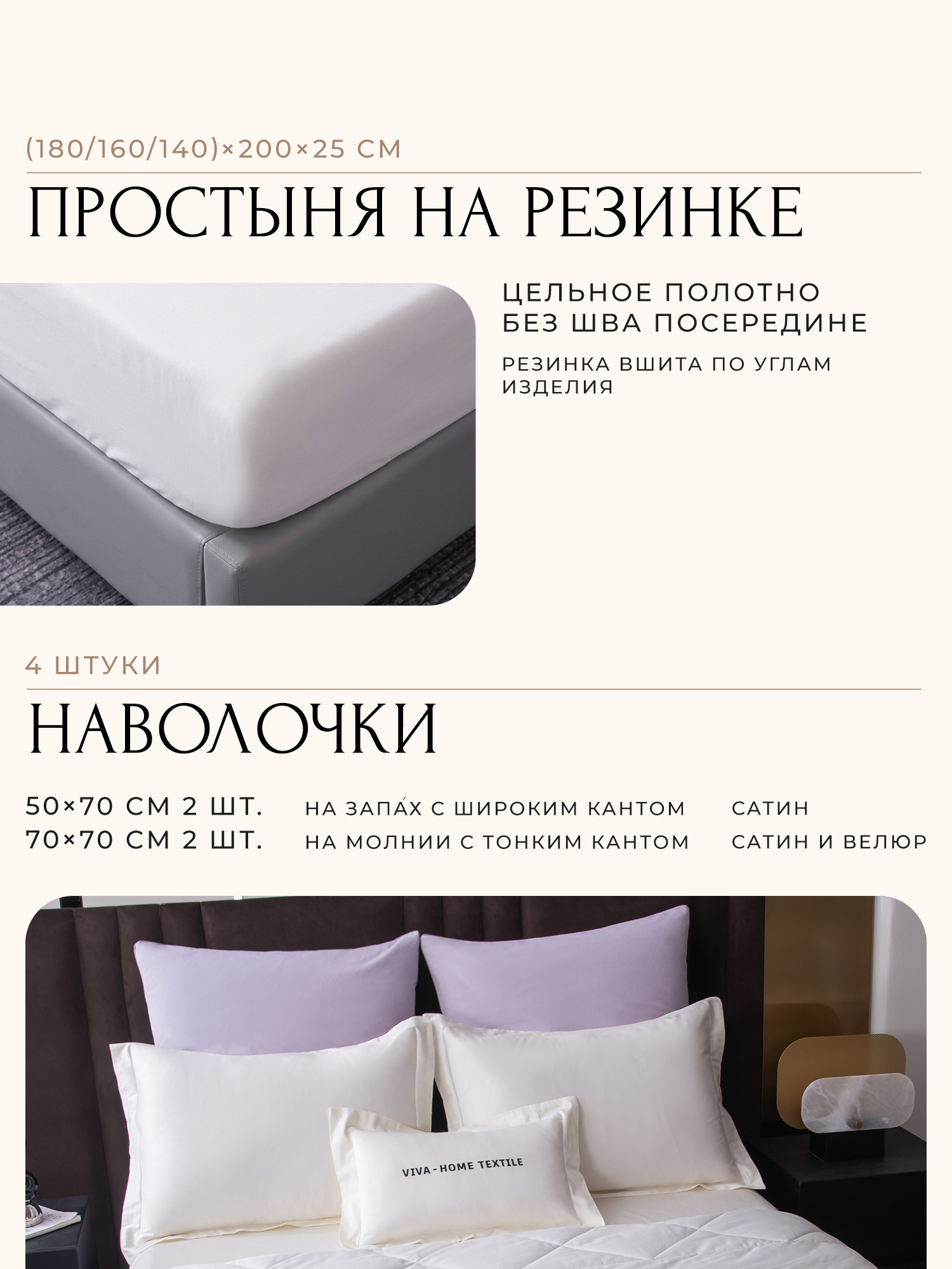 В комплект входят четыре наволочки: 50x70 см (2 шт) с запАхом (кармашком), выполненные из сатина 100% египетского хлопка, с ушками и широким кантом по периметру; 70x70 см (2 шт) на молнии - верх из мягкого велюра, низ из сатина 100% египетского хлопка, оформлены бархатным кантом.
