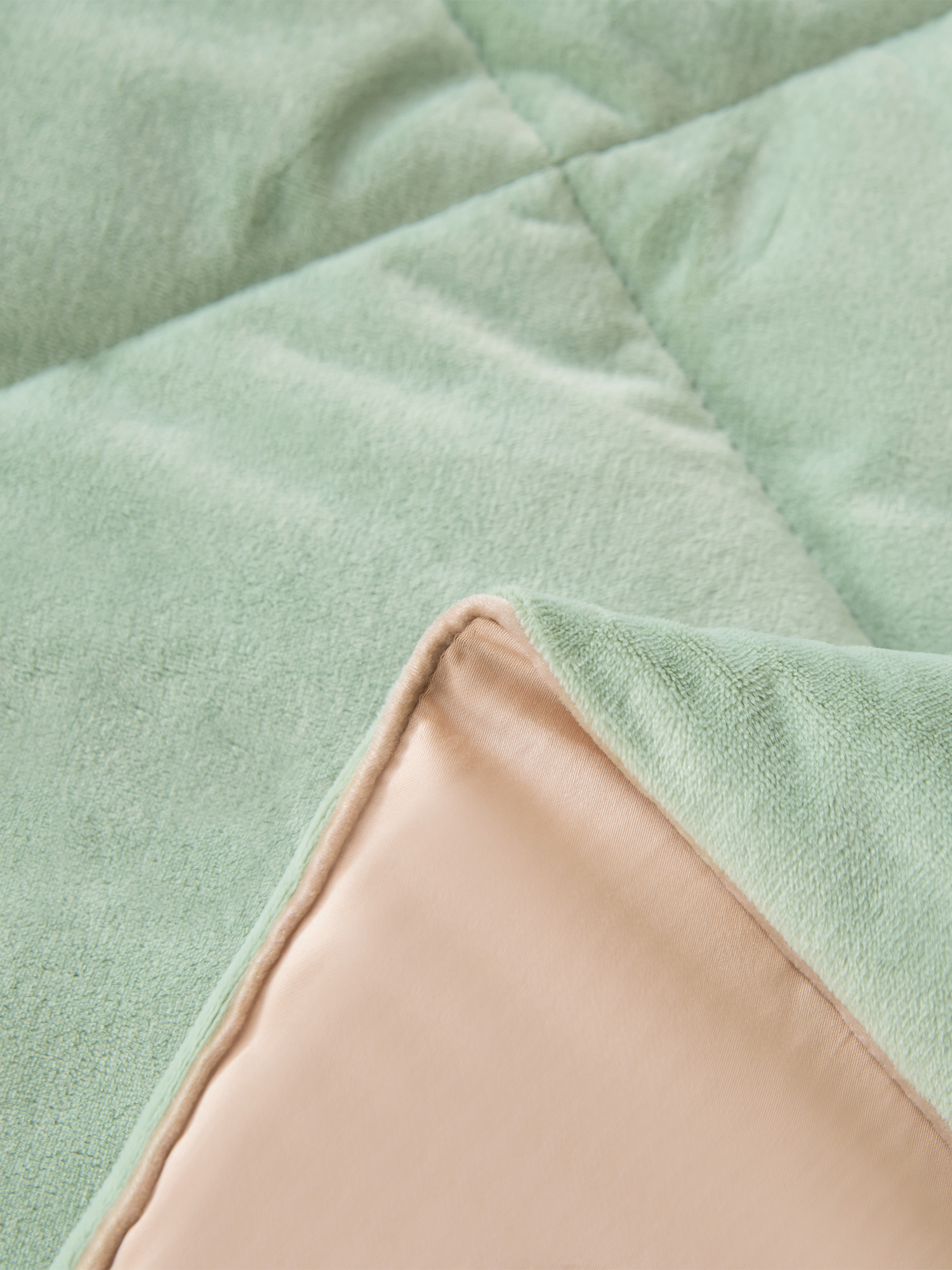 Одеяло выполнено с изысканной геометрической стёжкой и оформлено бархатным кантом. Верхняя сторона - мягкий велюр, придающий комплекту благородный внешний вид и особую уютность. Нижняя сторона - гладкий сатин из 100% египетского хлопка, отличающийся особой прочностью, шелковистым блеском и естественной воздухопроницаемостью. Наполнитель - современное 100% эковолокно микрогель: лёгкий, гипоаллергенный материал, который сохраняет форму даже после многократных стирок. Зимой под таким одеялом тепло и комфортно, а летом - свежо и легко, благодаря отличной циркуляции воздуха.