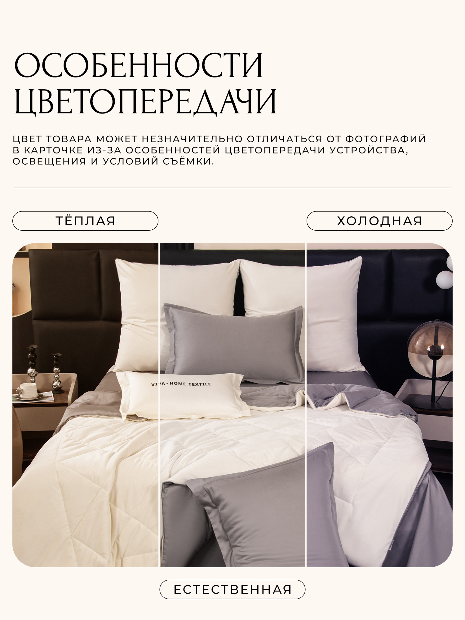 Одеяло и наволочки 70x70 с разных сторон разной расцветки и ткани; наволочки 50x70 однотонные; простыня такого же цвета, как низ одеяла