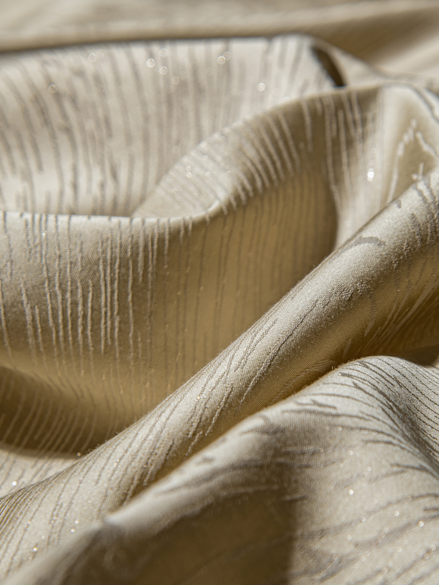 Жаккард из 100% хлопка, сотканный на специальных станках, впечатляет сложным рельефным рисунком. В переплетении используются тонкие золотые нити, которые мягко играют на свету, создавая мерцающий эффект, глубину узора и ощущение изысканной роскоши. Такой текстиль выглядит статусно и подчёркивает индивидуальность интерьера.