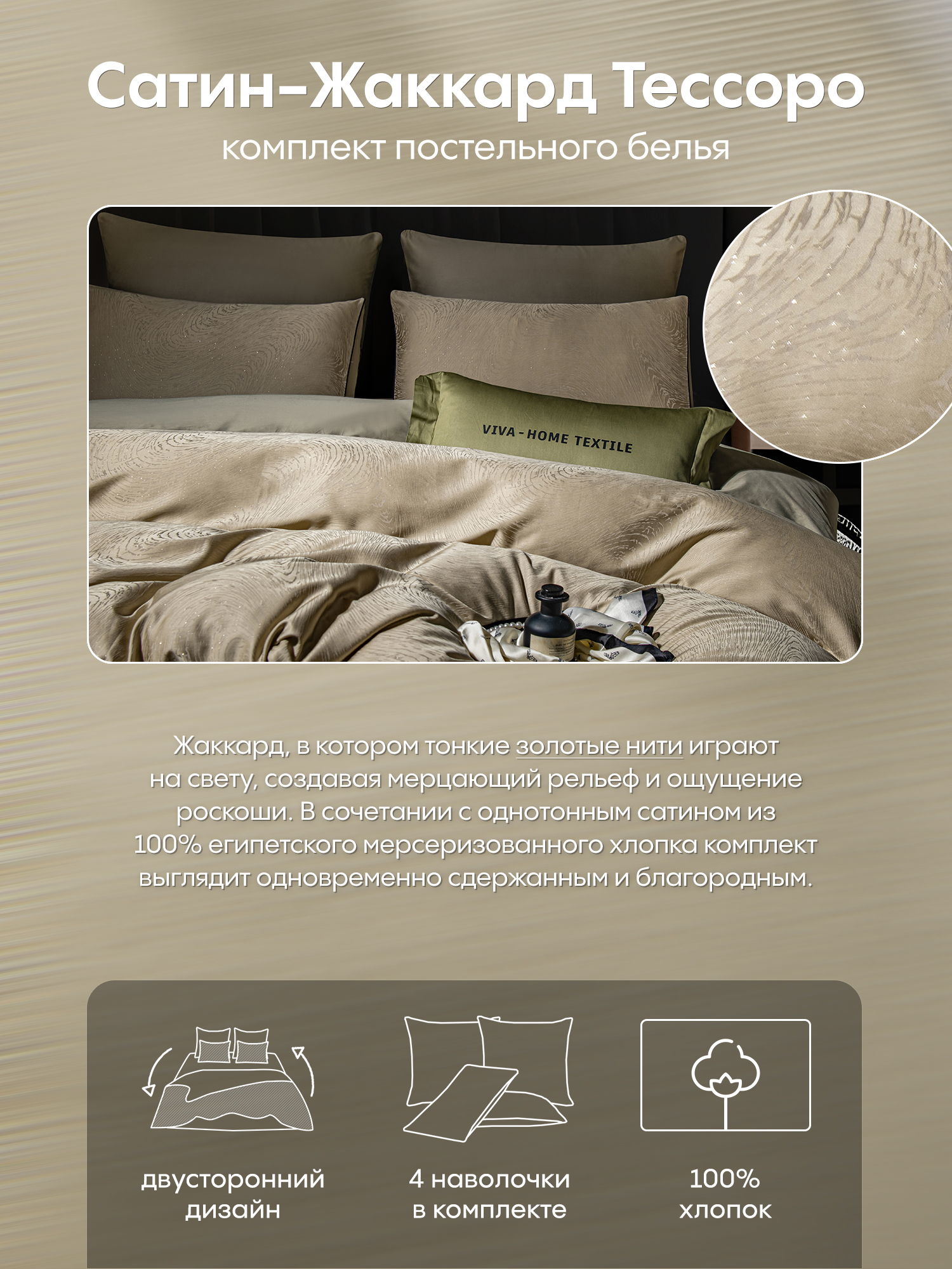 Коллекция Сатин-Жаккард Тессоро - это утончённое сочетание благородных материалов, выразительной фактуры и продуманного комфорта, созданное для по-настоящему роскошной спальни.