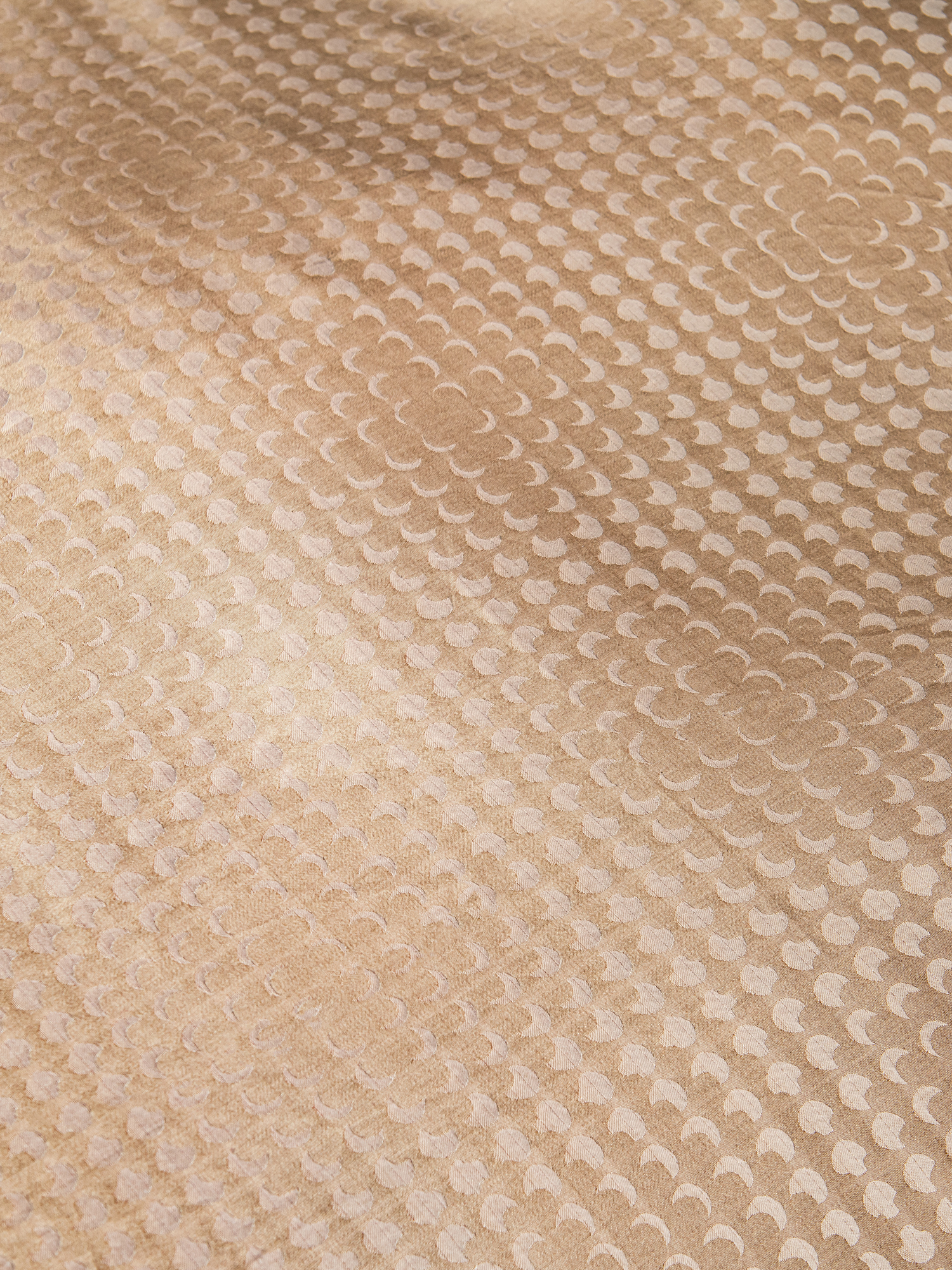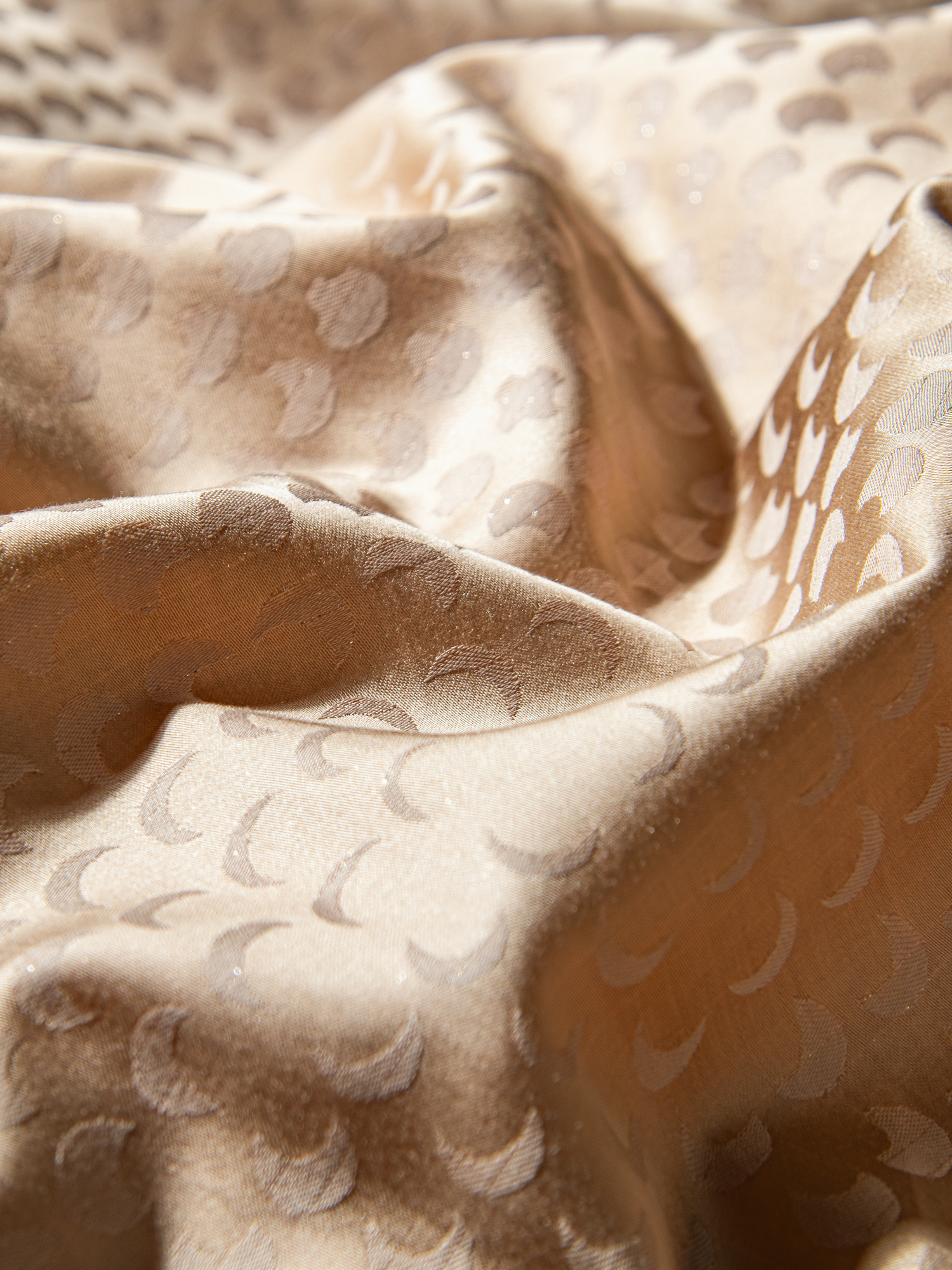 Жаккард из 100% хлопка, сотканный на специальных станках, впечатляет сложным рельефным рисунком. В переплетении используются тонкие золотые нити, которые мягко играют на свету, создавая мерцающий эффект, глубину узора и ощущение изысканной роскоши. Такой текстиль выглядит статусно и подчёркивает индивидуальность интерьера.